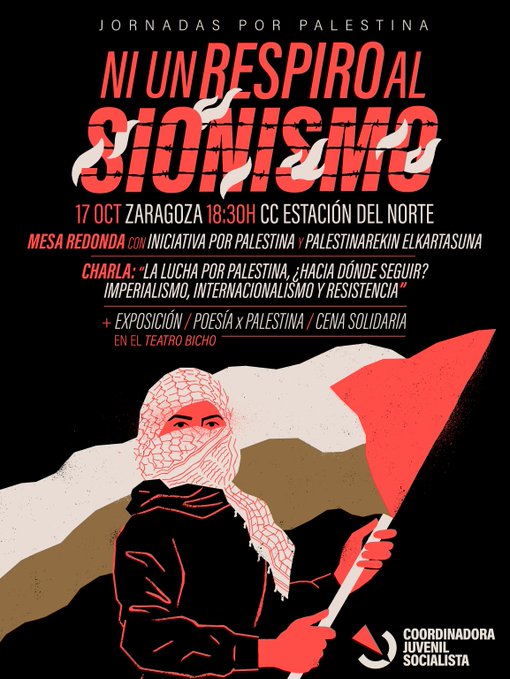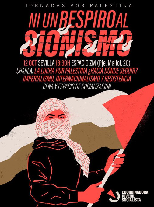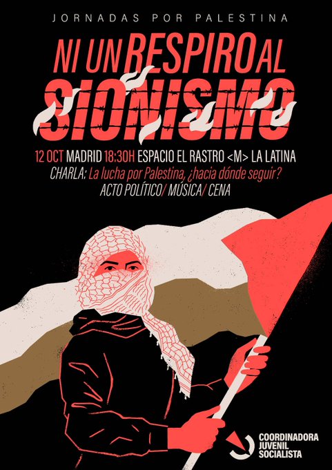 Para los próximos días 12 y 17 de octubre la Coordinadora Juvenil Socialista ha convocado a Jornadas por Palestina en Madrid, Sevilla y Zaragoza. Se propone seguir extendiendo la solidaridad con Palestina. La única solución pasa por la destrucción del Estado sionista de Israel.