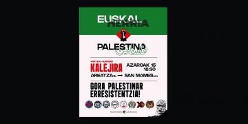 EUSKAL HERRIA – PALESTINA Las peñas de los equipos vascos y Palestinarekin Elkartasuna realizarán una kalejira conjunta el 15 de noviembre antes del partido. A las 18:30 horas. De Arenal a San Mamés ¡VIVA LA RESISTENCIA PALESTINA! —————————— EUSKAL HERRIA – PALESTINA Euskal taldeen harmailek eta Palestinarekin Elkartasunak kalejira bateratua egingo dugu azaroaren 15ean partidaren … Sigue leyendo 15 de noviembre, Bilbo: Kalejira antes del partido de las selecciones de Euskal Herria y Palestina