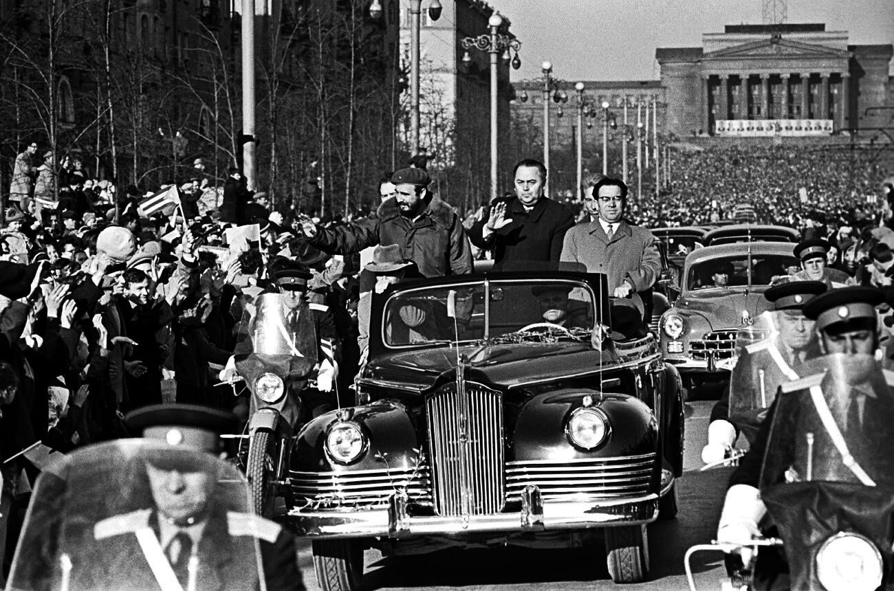 Fidel fue recibido en Moscú de manera entusiasta con prácticamente toda la población en las calles y en las ventanas y balcones de los edificios por donde pasó. Fue en 1963, durante su primera visita a la URSS, tras el triunfo de la Revolución Cubana el primero de enero de 1959.