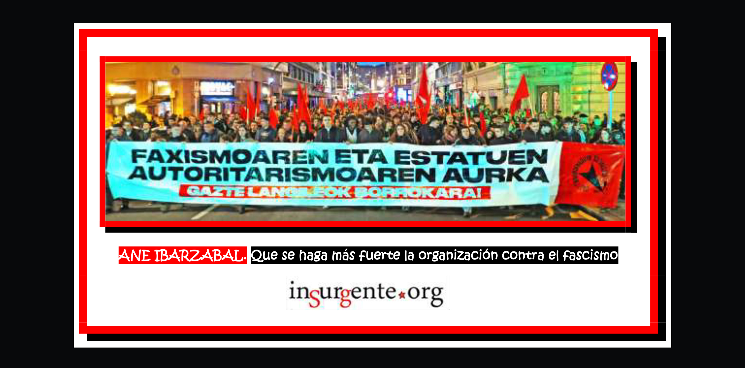 Me gustaría resumir cuatro mensajes claros planteados a través de la movilización. El primer mensaje, a Euskal Herria: el antifascismo se está organizando en las calles, en los Gaztetxes, en los centros de trabajo, en los pueblos y barrios y en los colegios. Porque hemos elegido responder al auge del fascismo con organización, compromiso y valentía, ya que somos miles y miles los jóvenes que no caemos en el discurso del fascismo y tenemos conciencia contra el capitalismo. Todo aquel que quiera sumarse y participar, tiene las puertas abiertas. El segundo es un mensaje internacionalista que va más allá de las fronteras de Euskal Herria: con esta movilización contra el fascismo y el capitalismo nos gustaría poner nuestro grano de arena para revivir la ilusión en la clase obrera y sobre todo en la izquierda revolucionaria, y extender la lucha territorio por territorio. A esos que, en el desierto que ha dejado la izquierda institucional, se han hartado de promesas de migajas y de la política del mal menor, les decimos que hay una alternativa. Y tendemos la mano a los agentes de izquierda, para ir de la mano en la lucha contra el fascismo. El tercer mensaje, a los fascistas: estamos en las calles, estamos en los pueblos, y tenemos intenciones claras. Somos un obstáculo consciente y organizado en la difusión de la reacción, no utilizaréis a Euskal Herria para vuestro espectáculo; no estabilizaréis vuestros discursos racistas, clasistas y machistas. No al menos sin nuestra resistencia. El cuarto y último mensaje, a los políticos profesionales: lleváis mucho tiempo alimentando el contexto que hace fuerte al fascismo y menospreciando y criminalizando toda organización y lucha fuera de las instituciones, pero la juventud trabajadora está haciendo su propio camino.