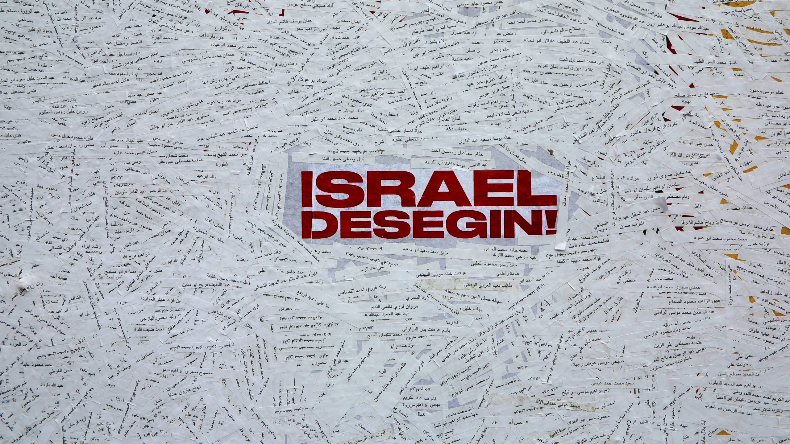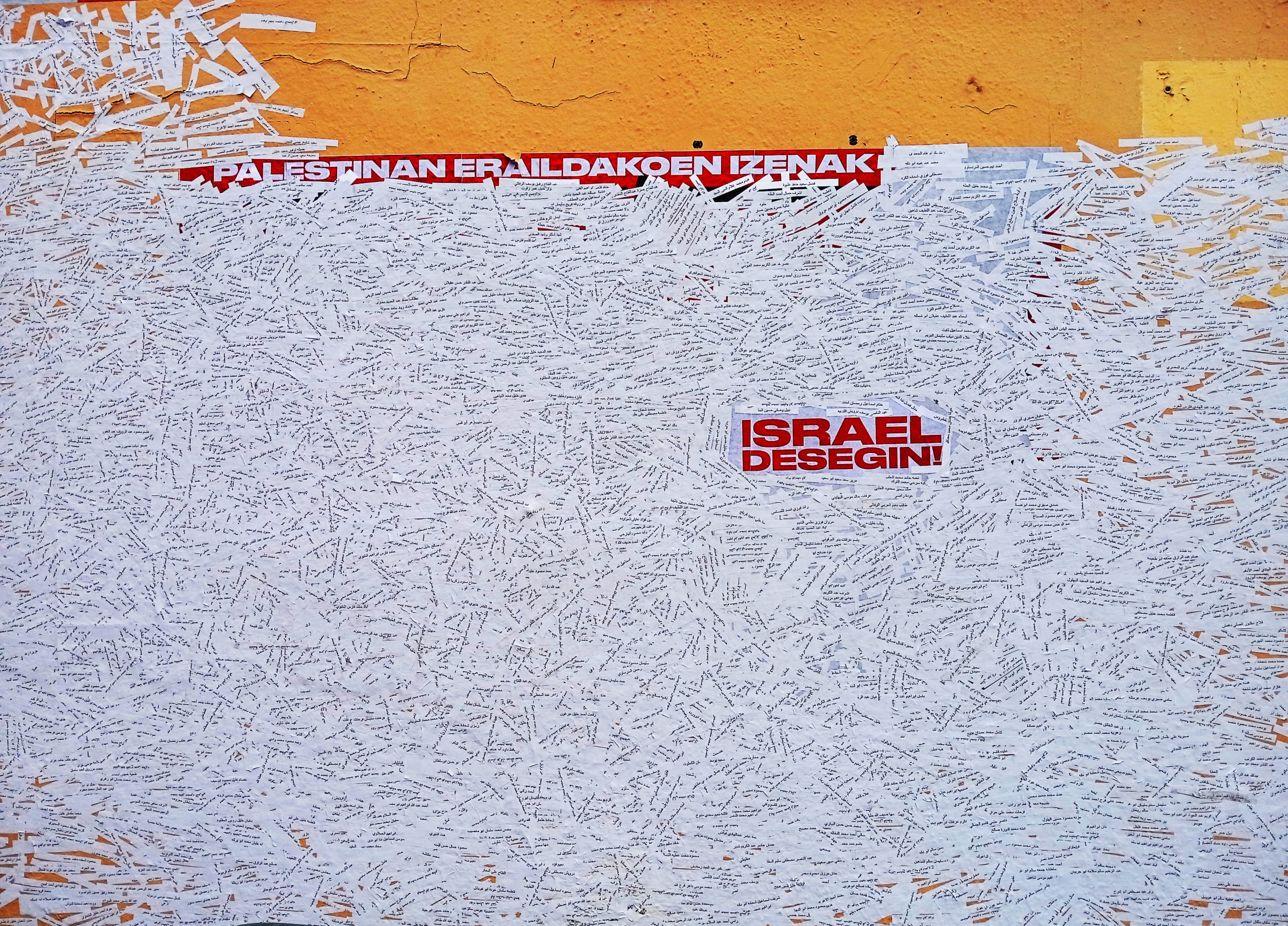 Aquí se leyeron los nombres y apellidos de buena parte de los/as más de 70.000 palestinos/as asesinados/as por el Estado de Israel. Igualmente, recortados y en papel, fueron pegados en una pared céntrica de la localidad por manos militantes y de gente que pasaba por el lugar. Así quedó la pared, así quedó el homenaje de la juventud comunista a todas esas personas y a su heroico pueblo.