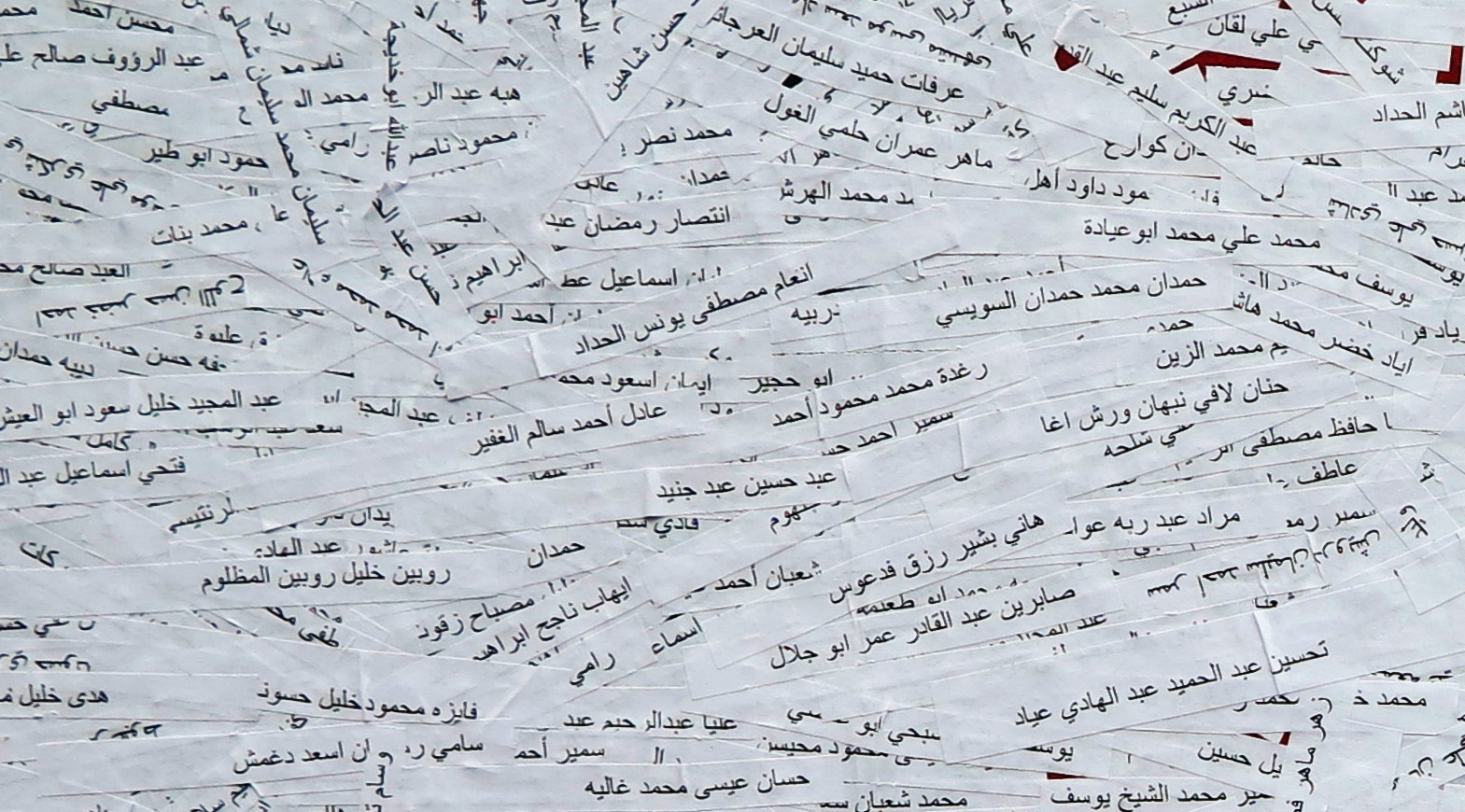 Aquí se leyeron los nombres y apellidos de buena parte de los/as más de 70.000 palestinos/as asesinados/as por el Estado de Israel. Igualmente, recortados y en papel, fueron pegados en una pared céntrica de la localidad por manos militantes y de gente que pasaba por el lugar. Así quedó la pared, así quedó el homenaje de la juventud comunista a todas esas personas y a su heroico pueblo.