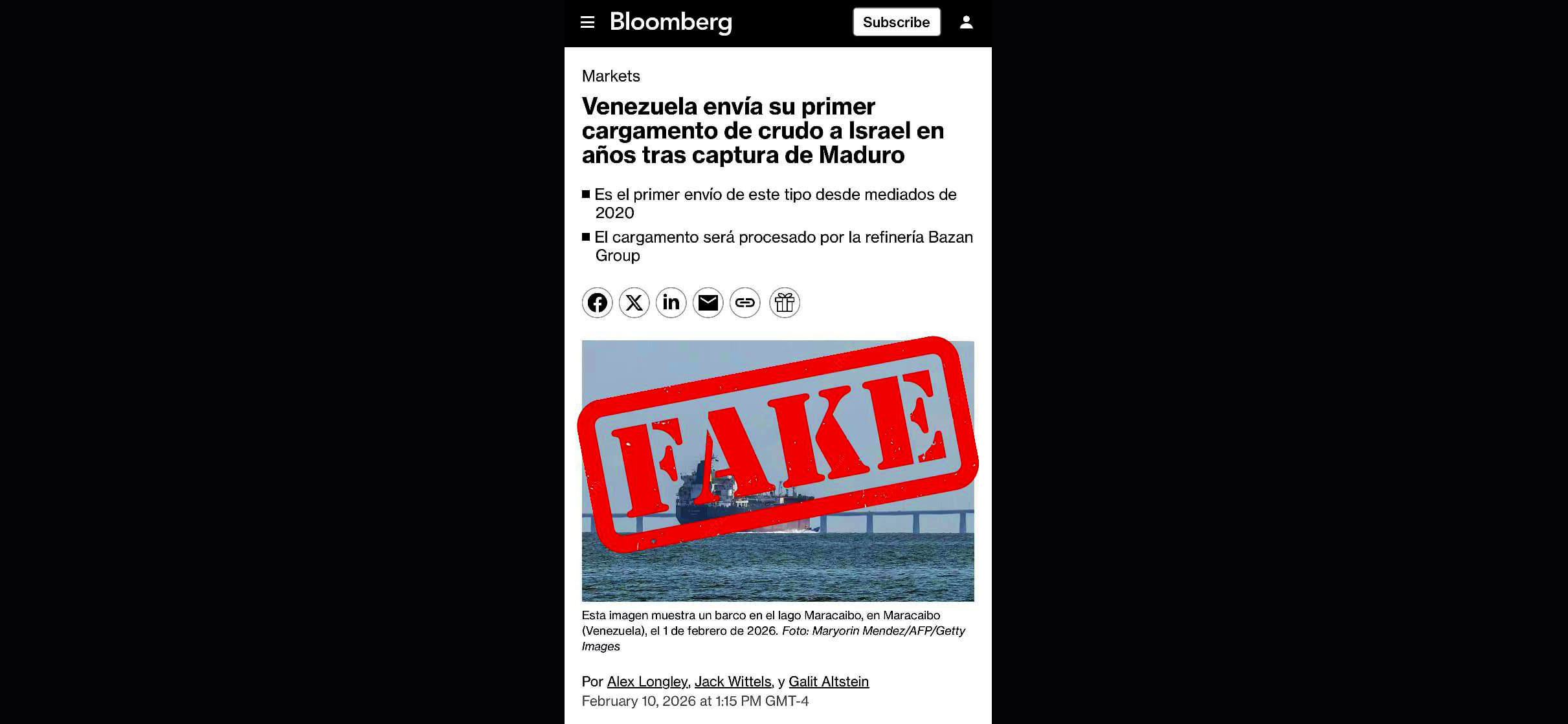 En este caso concreto nos referimos a una noticia difundida ayer por Bloomberg, cuyo titular dice: “Venezuela envía su primer cargamento de crudo a Israel en años tras captura de Maduro”. Además, subraya que “el cargamento será procesado por la refinería Bazan Group”.