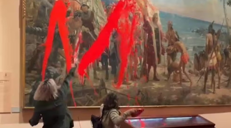 Durante el desfile por el Día de la Fiesta Nacional, un grupo de activistas de Futuro Vegeta ha arrojado pintura roja en una obra expuesta en el Museo Naval de Madrid. El cuadro afectado es ‘Primer homenaje a Cristóbal Colón’ (1892), por José Santiago Garnelo y Alda.