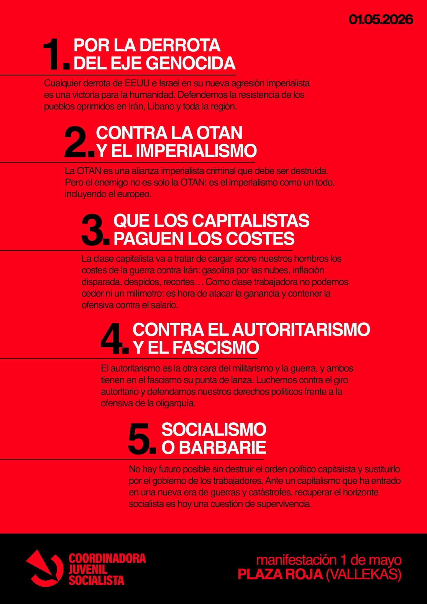 Para este Primero de Mayo, día internacional de la clase trabajadora, la Coordinadora Juvenil Socialista (CJS) ha hecho un llamado a tomar las calles contra la guerra imperialista y el fascismo. Conscientes de que el capitalismo es la guerra, convocan a unirse a la lucha.
