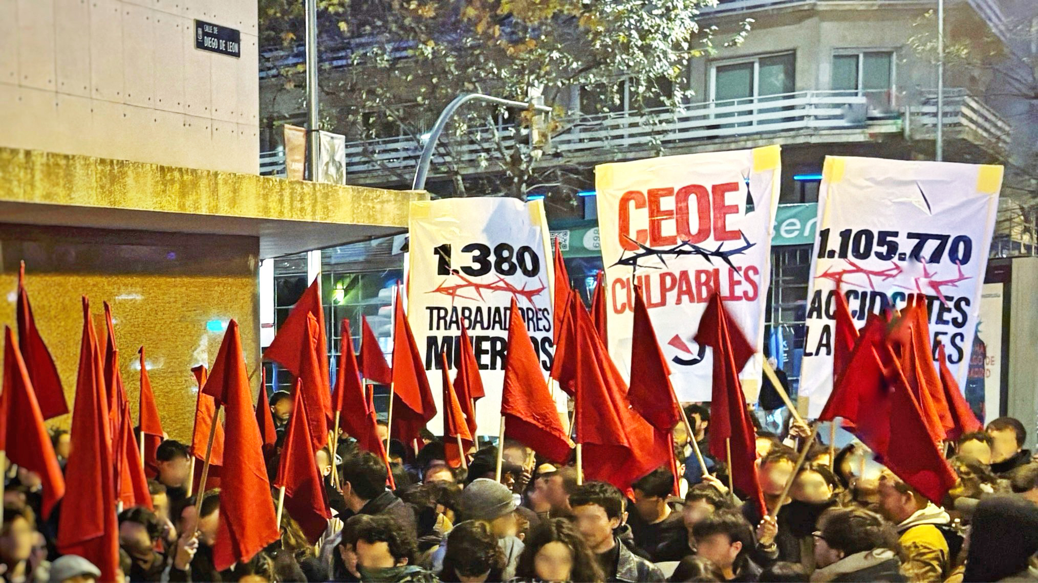 La movilización tuvo lugar, ayer, domingo, frente a la sede de la CEOE, en Madrid, ya que consideran que para el capital la vida de los trabajadores vale menos que sus ingentes e insultantes beneficios. Lo dijeron muy claro: “¡Sus beneficios, nuestros muertos! ¡Capitalismo asesino!”.