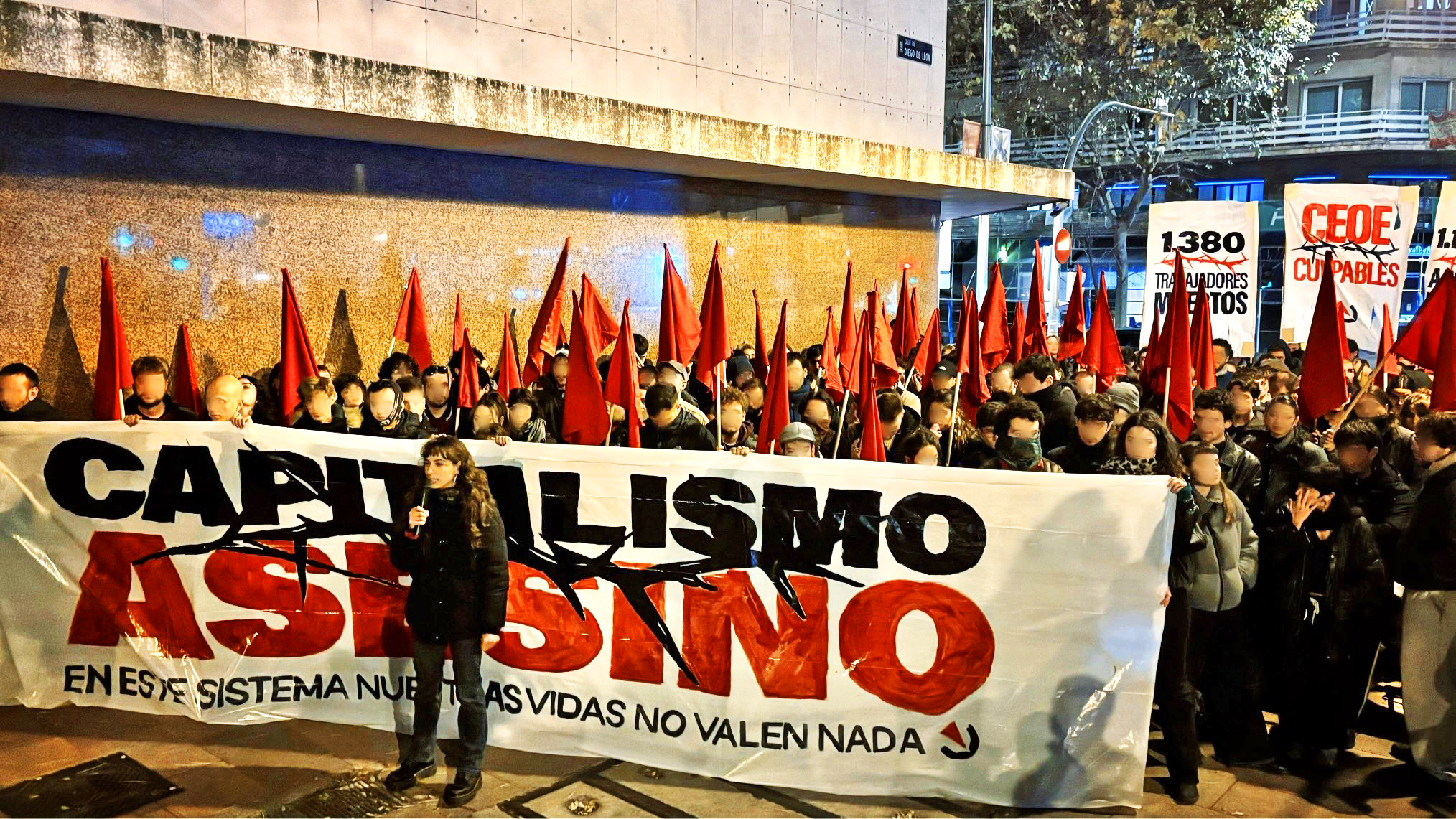 La movilización tuvo lugar, ayer, domingo, frente a la sede de la CEOE, en Madrid, ya que consideran que para el capital la vida de los trabajadores vale menos que sus ingentes e insultantes beneficios. Lo dijeron muy claro: “¡Sus beneficios, nuestros muertos! ¡Capitalismo asesino!”.