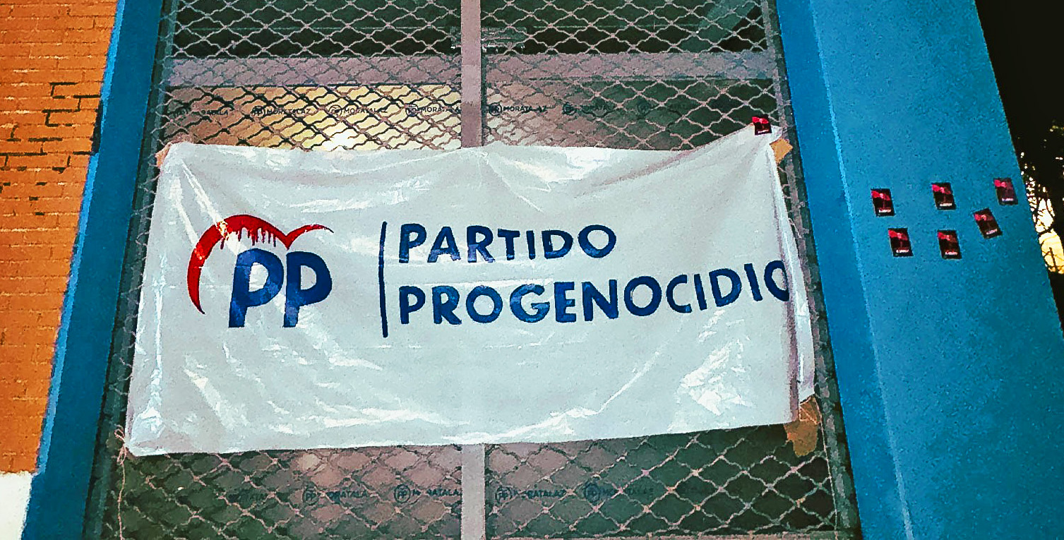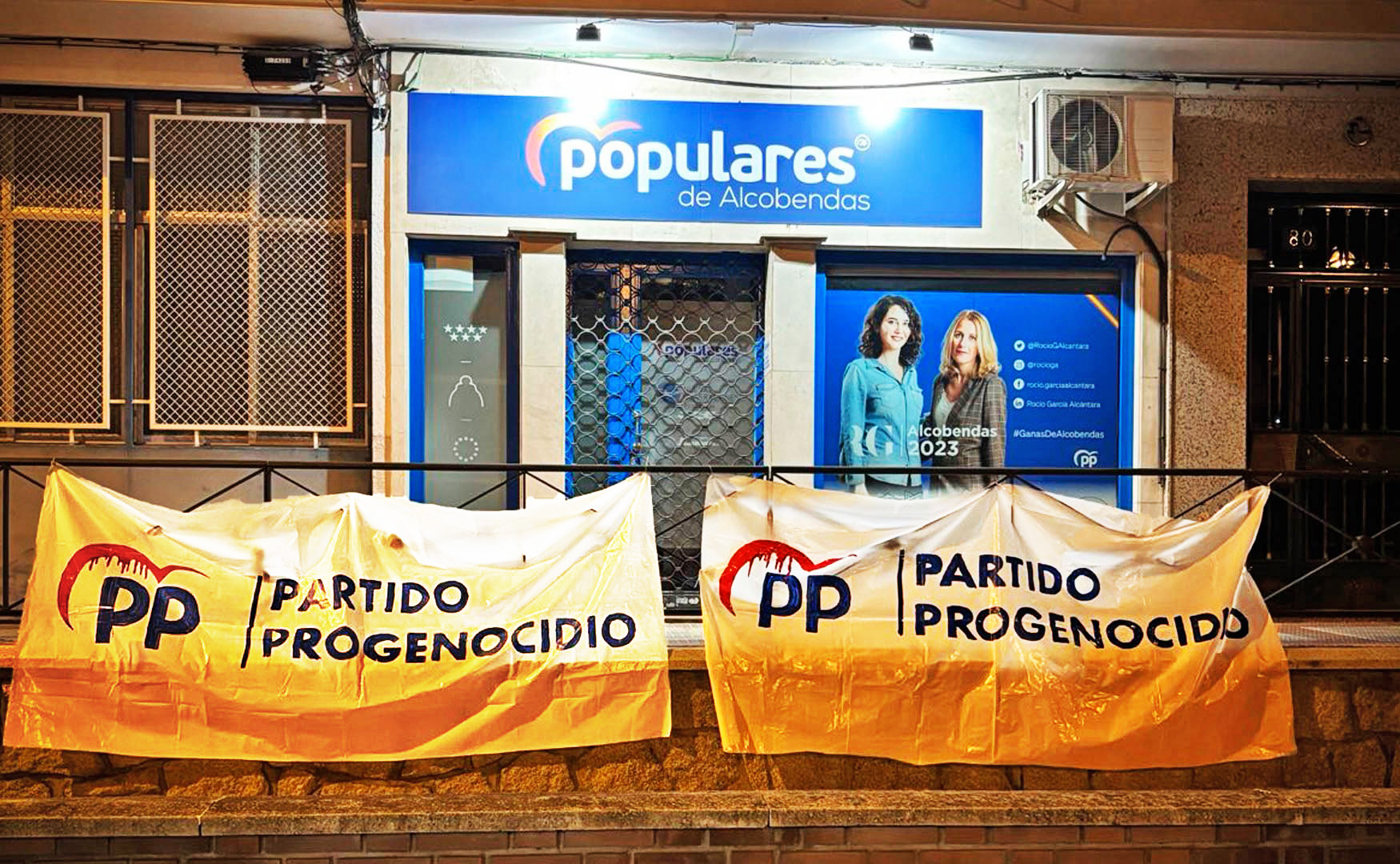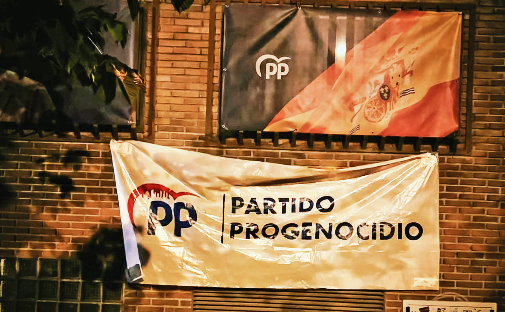 La acción, acontecida ayer, 30 de septiembre, ha consistido en colgar varias pancartas en diferentes sedes de dicho partido con las palabras “PP partido progenocidio”. CJS denuncia al PP, pero especialmente a Isabel Díaz Ayuso, presidenta del Gobierno de la Comunidad de Madrid, “por su apoyo al Estado genocida de Israel y su criminalización de la solidaridad con Palestina”.