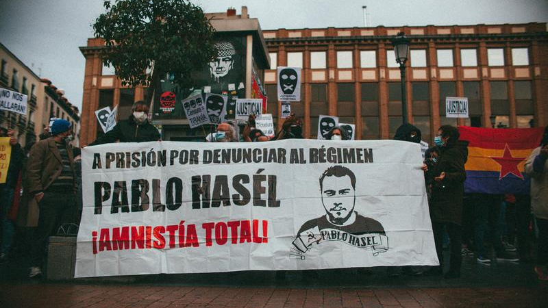 La entidad independentista considera el de Pablo Hasel un caso paradigmático en la represión política ya que el rapero fue condenado por el contenido de sus canciones contra la monarquía y su compromiso con la militancia comunista, lo que hizo que se le aplicasen los delitos de enaltecimiento del terrorismo e injurias a la corona.