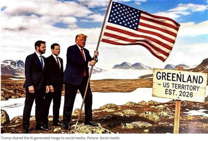 El presidente ha compartido una imagen generada por inteligencia artificial de él mismo junto a Marco Rubio y JD Vance plantando la bandera de Estados Unidos en Groenlandia, con un cartel que dice «Groenlandia – Territorio de Estados Unidos – Est. 2026».