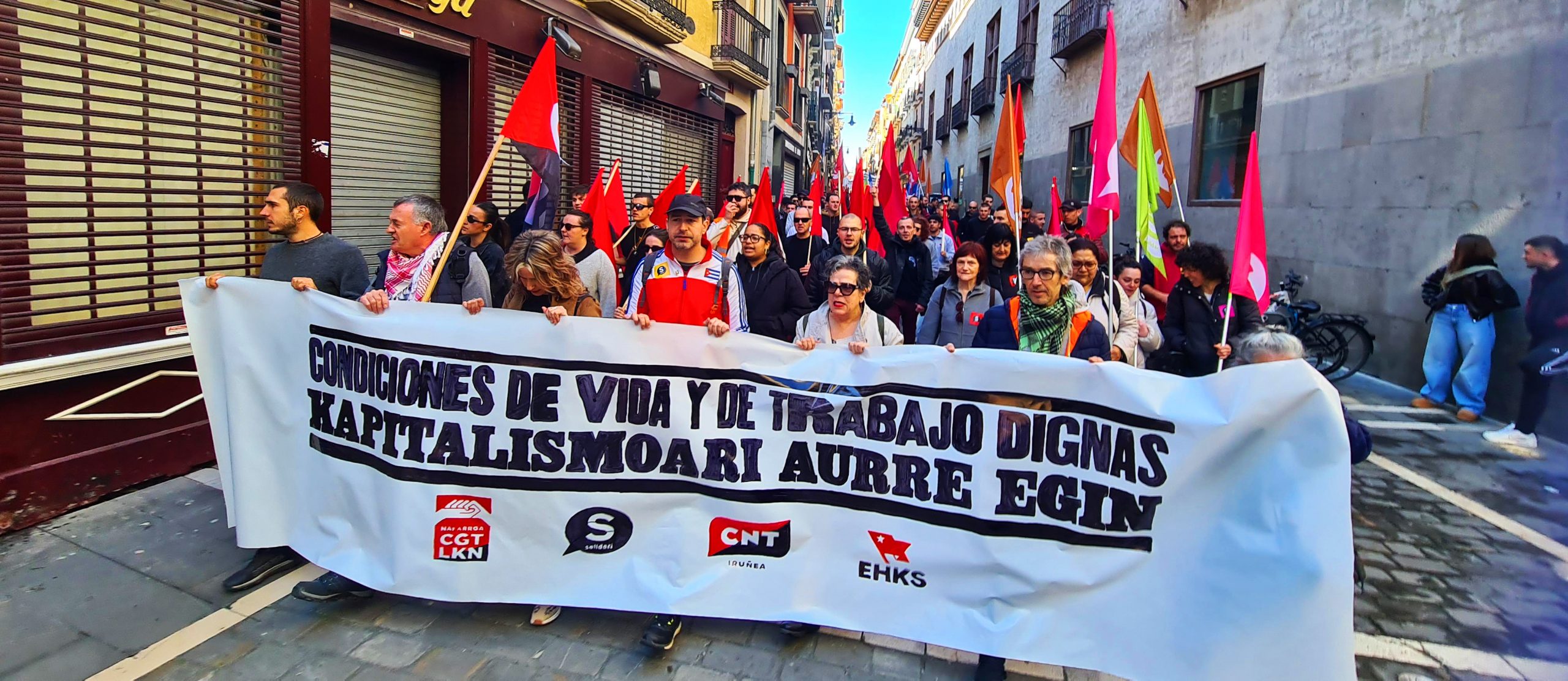 En Iruñea (Nafarroa), EHKS y varios sindicatos navarros, concretamente la CGT, Solidari y la CNT, hicieron un llamamiento conjunto a la movilización. La manifestación ha comenzado a las 11:30 en la Plaza de la Recoleta, bajo el lema: “Condiciones de vida y de trabajo dignas. ¡Lucha contra el capitalismo!”. Previamente, habían realizado piquetes en varios barrios de Iruñea y se han concentrado frente a la CEN, la asociación empresarial. “Queremos difundir el mensaje a favor de la organización internacional de la clase trabajadora. Contra la guerra, la pobreza y la oligarquía que las fomenta”, han subrayado al finalizar la movilización.