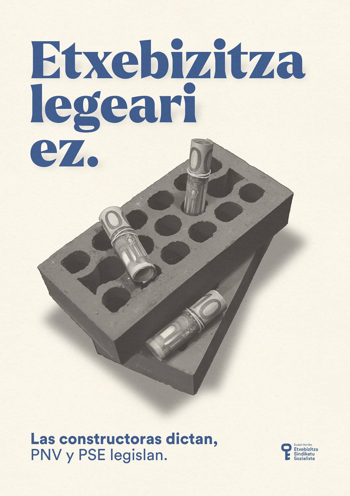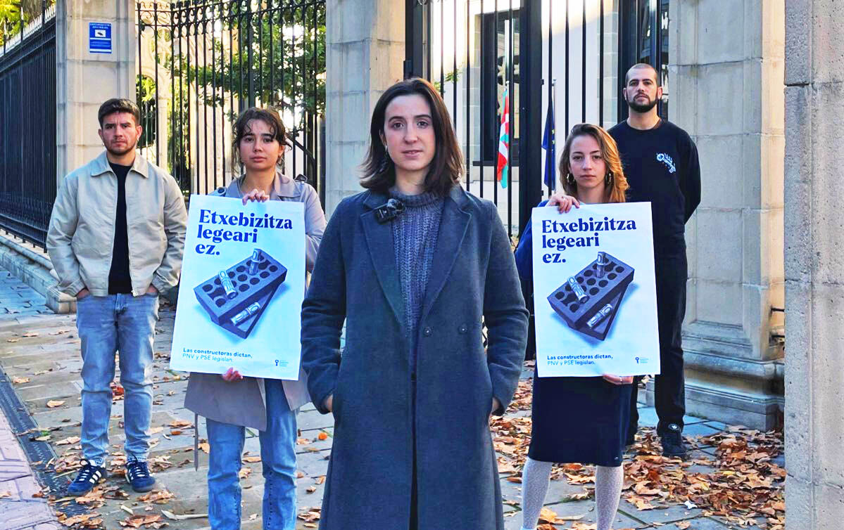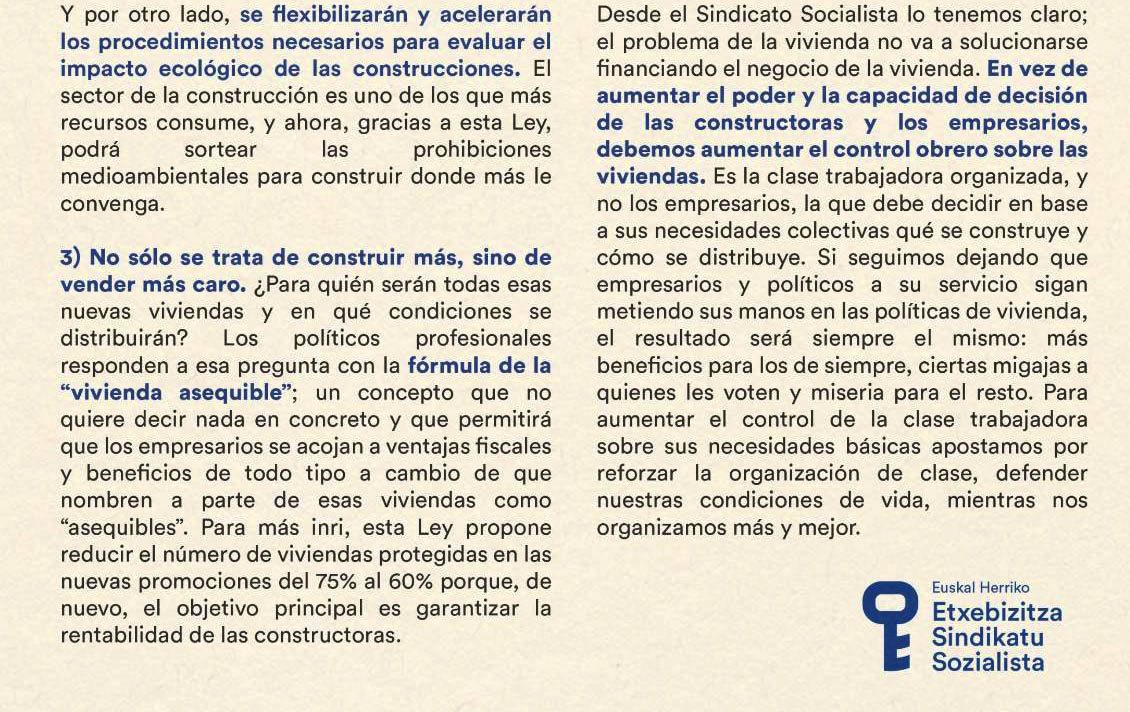 El Sindicato Socialista de Vivienda expresó que “las constructoras dictan, PNV y PSE legislan”, añadiendo que “pronto se aprobará la nueva Ley de Vivienda Vasca y queremos denunciar que su principal objetivo es relanzar un nuevo ciclo constructivo y rentista”.