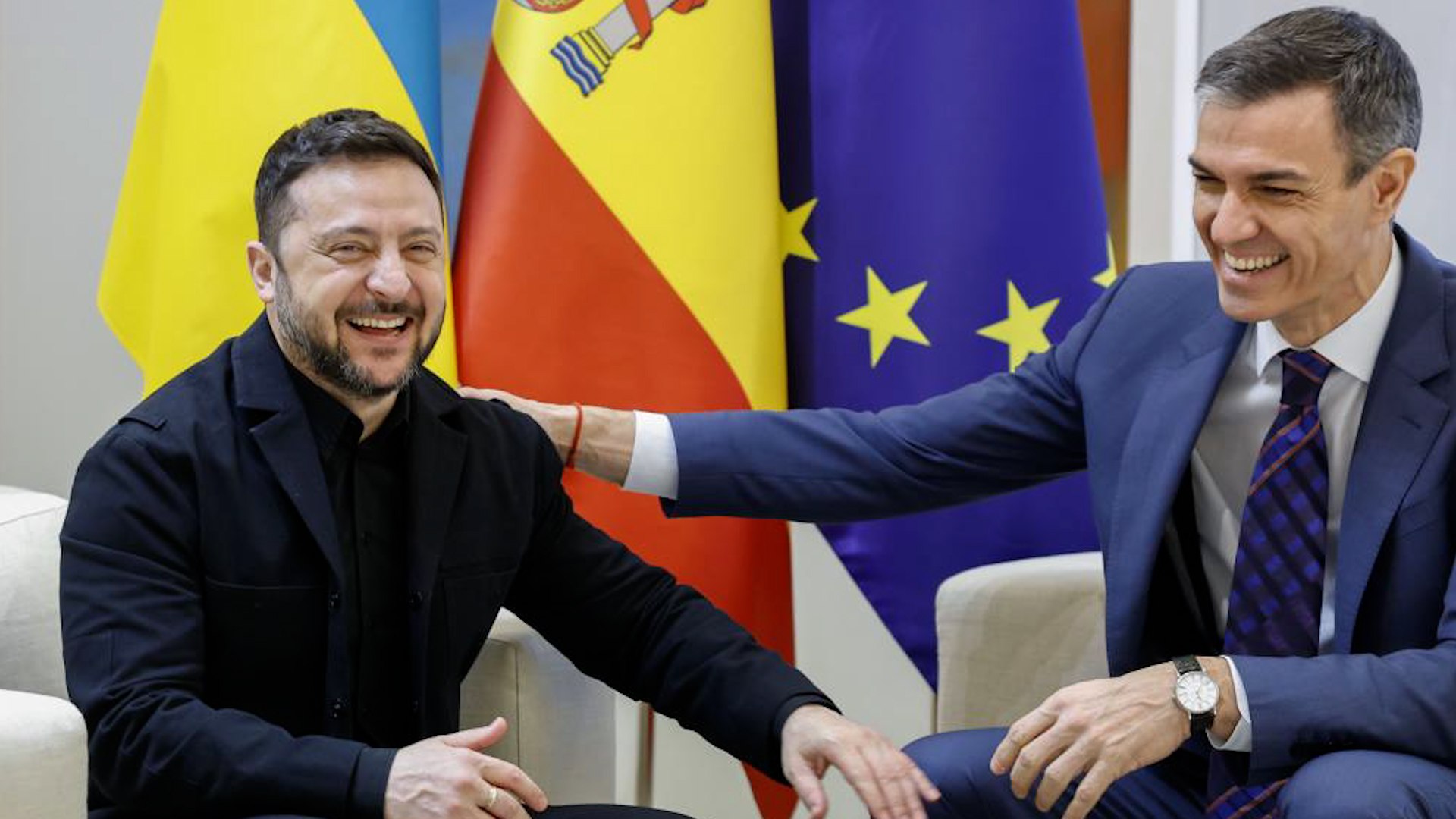 El presidente de Ucrania, Volodímir Zelenski, y el presidente del Gobierno español, Pedro Sánchez, han escenificado este miércoles en Madrid la buena sintonía existente entre el gobierno neonazi y el Ejecutivo “socialista” (PSOE/Sumar y PCE).