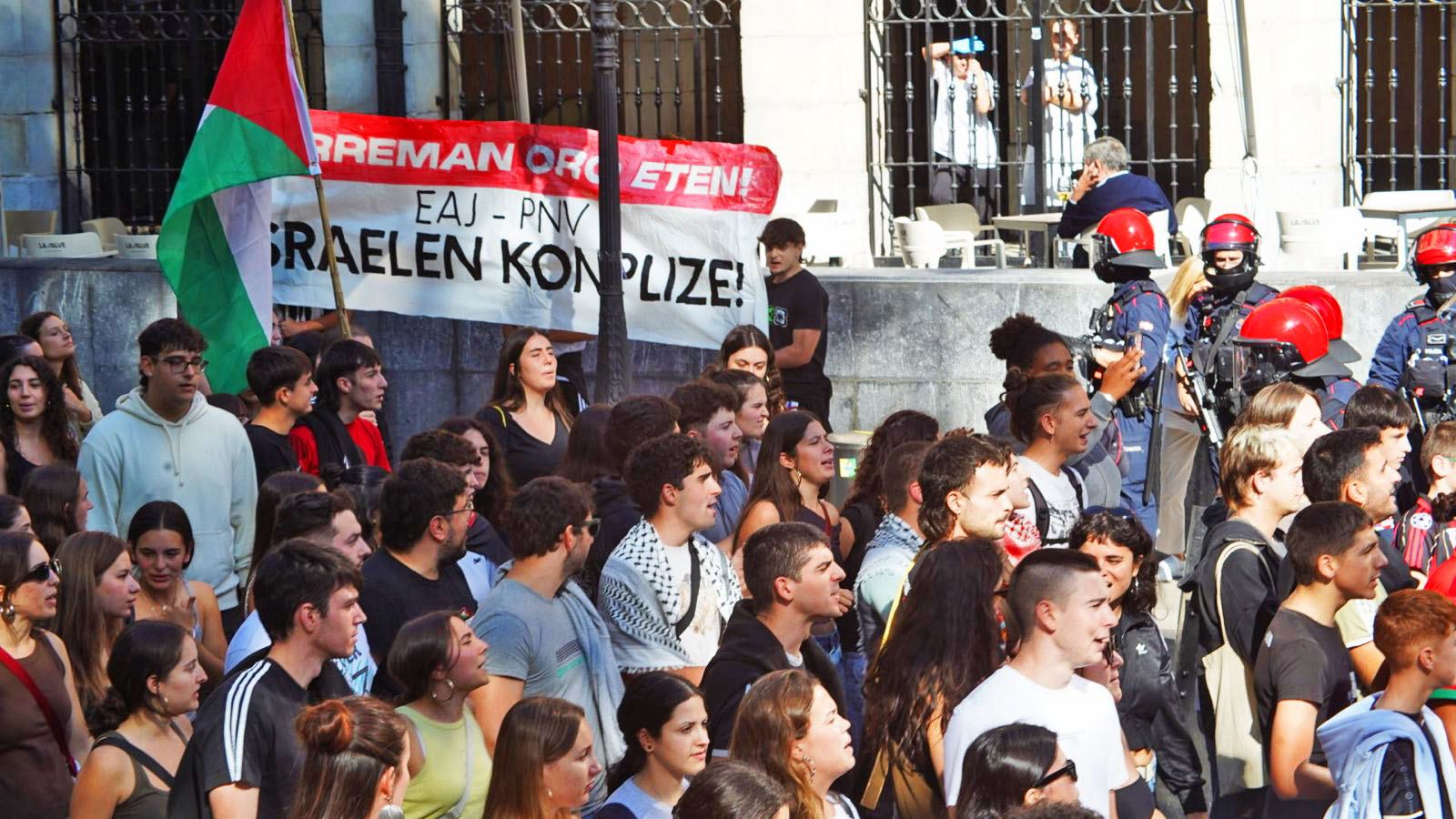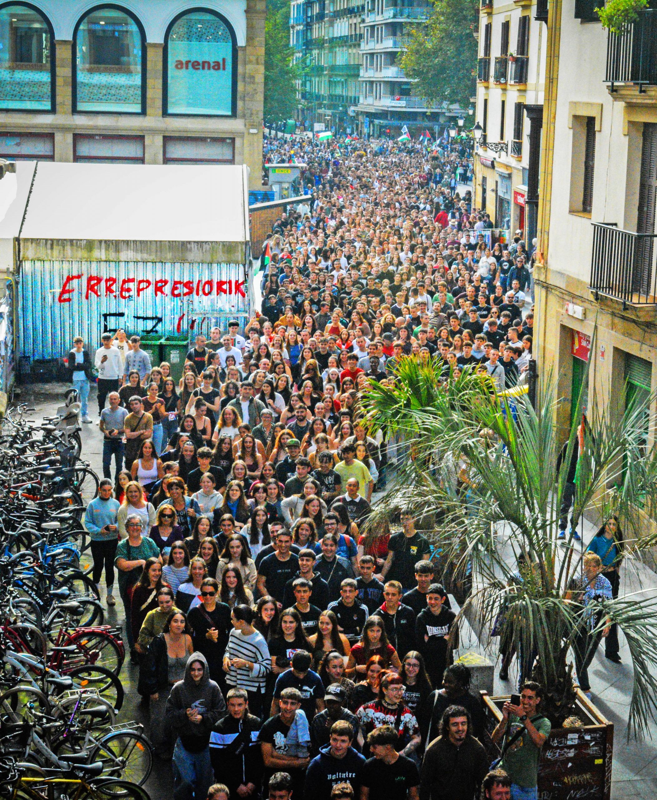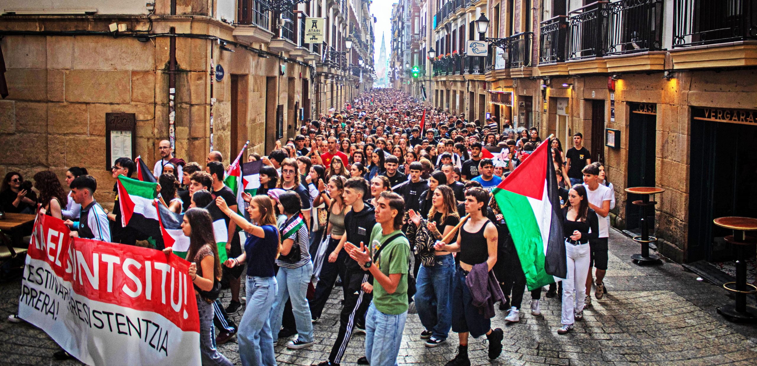 Tras la llegada de las manifestaciones a donde estaba previsto, Ikasle Abertzaleak ha expresado algunas cosas mediante la lectura de comunicados. IA ha recordado que los estudiantes habían “vaciado las escuelas de todo el País Vasco y salido a la calle”, hoy como el 2 de octubre, “para exigir la destrucción de Israel y expresar nuestro apoyo a la resistencia palestina”. Y ha añadido: “Más de 70.000 muertos, otros tantos hambrientos, Gaza completamente destruida y miles y miles huyendo de sus tierras. Así terminaron los palestinos y eso es Israel: un Estado terrorista, genocida y sionista, y no cabe duda de que repetirá las masacres siempre que tenga oportunidad”. Por eso exige la destrucción de Israel y por eso denuncia a “todos los cómplices que blanquean la imagen de Israel”.