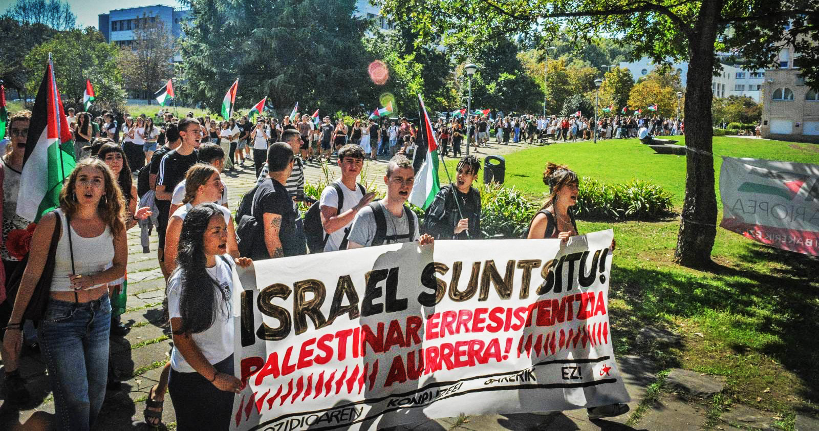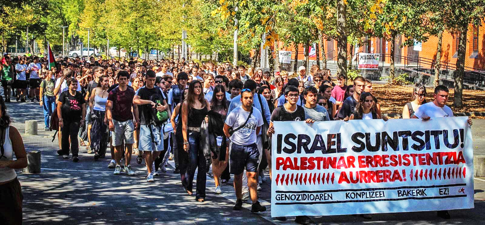 Cientos de estudiantes se movilizaron en Iruñea (Nafarroa), Gasteiz (Araba), Ibaeta (Donostia, Gipuzkoa) y Leioa (Bizkaia), capitales vascas donde llamaron a romper cualquier vínculo con el Estado de Israel. IA consideró que el movimiento estudiantil vasco puede hacer en este momento “dos aportaciones modestas pero imprescindibles”: “luchar a favor de la resistencia palestina frente a discursos vacíos y oportunistas”; y “señalar y presionar a todos los cómplices del genocidio, para que rompan sus relaciones con Israel”.