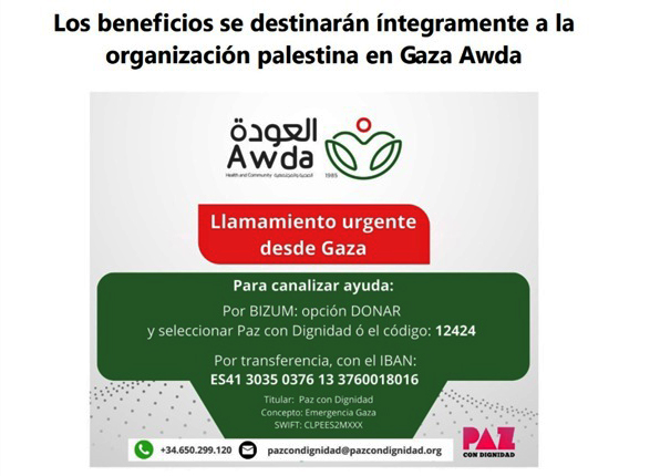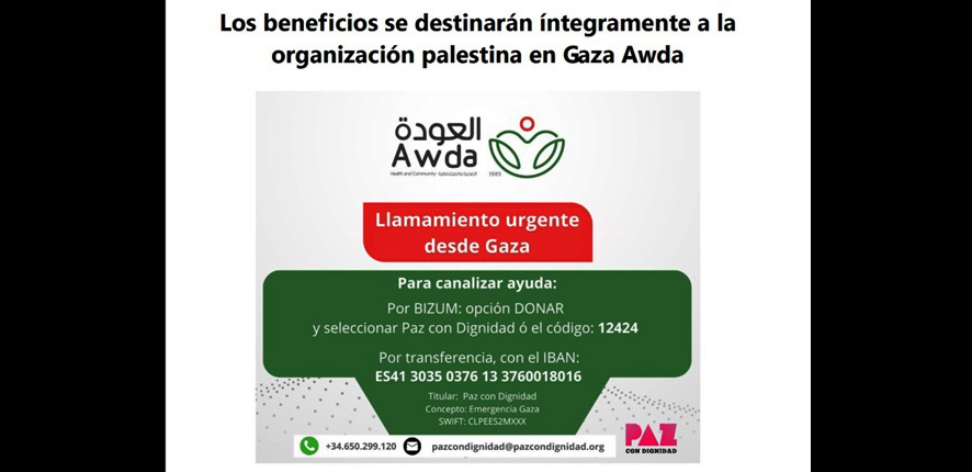 La Asociación Al Awda (https://www.facebook.com/awdaps; https://www.instagram.com/awda.ps/) es una organización palestina de ayuda humanitaria y derechos humanos que trabaja desde 1985 en materia de salud con y para la población civil palestina, especialmente personas enfermas y heridas. El apoyo económico se canaliza a través de Paz con Dignidad, organización que lleva acompañando y apoyando a Awda desde 2009 en esta misión. Awda está comprometida con continuar salvando vidas y aliviar el sufrimiento de miles de personas heridas y/o desplazadas internas como consecuencia de los ataques y el bloqueo israelí en la Franja de Gaza. Esta entidad gestionaba 2 hospitales y 6 centros socio-sanitarios. Todas las instalaciones han sufrido ataques y bombardeos, el hospital Awda en Jabalia (campo de personas refugiadas al norte de Gaza) ha estado atendiendo a personas hasta mayo de 2025, cuando fue forzado por Israel a ser evacuado. Parte del personal sanitario ha sido asesinado, herido o detenido. Aun así, el equipo médico-sanitario continúa trabajando, mostrando así la resiliencia del pueblo palestino y su compromiso ético médico. En octubre de 2024 Awda puso en marcha el hospital de campaña 1 en Nuseirat (centro-sur de Gaza) y en septiembre de 2025 ha habilitado un área de atención materno-infantil. Este trabajo puede sostenerse gracias, entre otras colaboraciones, a las donaciones recibidas a través de la asociación Paz con Dignidad, que ya se ha canalizado aproximadamente 1 millón de euros.