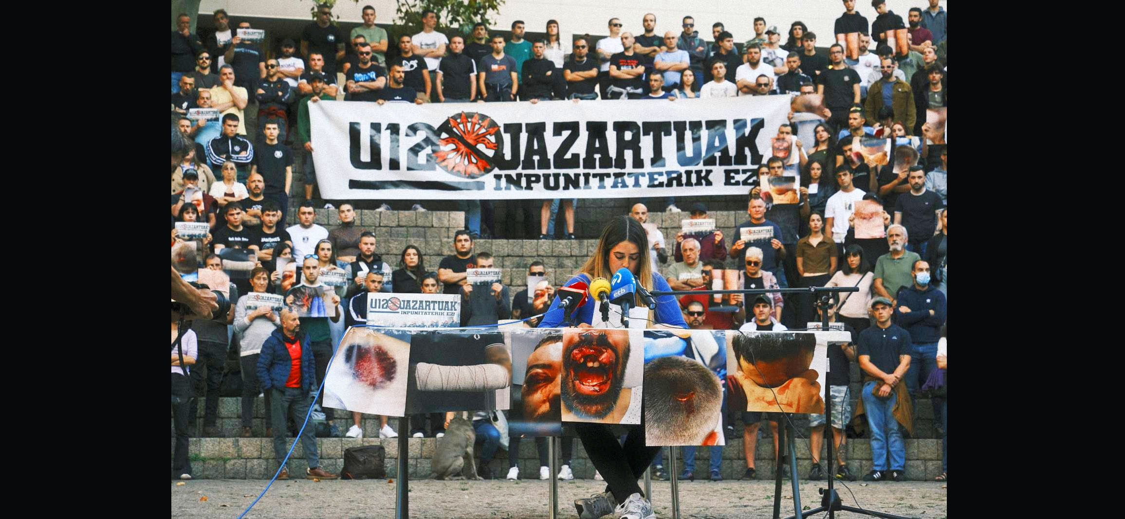 U12 Jazartuak, plataforma que agrupa a afectados y testigos de la intervención policial en Gasteiz (Araba) el pasado 12 de octubre, compareció para denunciar las agresiones de la Ertzaintza a no pocas personas que acudieron movilizarse en contra de la concentración de la Falange Española de las JONS. Con la lectura de un comunicado, U12 Jazartuak señaló que algunas personas fueron golpeadas con porras en la cabeza y el rosto cuando se encontraban en el suelo, recibieron disparos con pelotas de goma al rostro y atropellos arbitrarios con furgonetas de la policía.