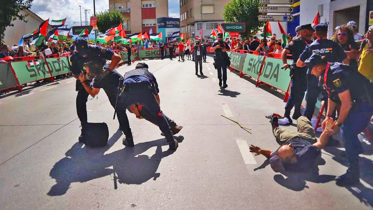 Ayer, domingo 7 de septiembre, fue Lugo (Galiza) donde se protestó contra la participación del equipo Israel Premier Tech. Aquí, fueron ocho las personas fueron detenidas en O Corgo tras intentar cortar la carretera principal al paso del pelotón. Y en Monforte de Lemos la Policía detuvo a otras dos personas. Los uniformados también cargaron violentamente contra los manifestantes.