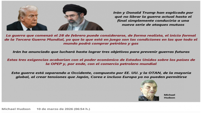 La guerra que comenzó el 28 de febrero puede considerarse, de forma realista, el inicio formal de la Tercera Guerra Mundial, ya que lo que está en juego son las condiciones en las que todo el mundo podrá comprar petróleo y gas. ¿Pueden comprar esta energía a exportadores en divisas distintas del dólar, encabezados por Rusia e Irán (y, hasta hace poco, Venezuela)? ¿La actual exigencia estadounidense de controlar el comercio internacional de petróleo exigirá a los países exportadores de petróleo que lo fijen en dólares y, de hecho, que reciclen sus ingresos por exportaciones y ahorro nacional en inversiones en valores, bonos y acciones del gobierno estadounidense?