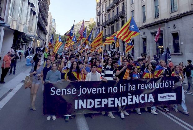 La marcha, encabezada por una pancarta con el lema «Sin juventud no hay revolución. Independencia», ha empezado poco después de las seis de la tarde en la plaza Urquinaona y ha avanzado por la Vía Layetana , entre muchas banderas esteladas y gritos como «1 de octubre, ni olvido ni perdón», «Independencia».