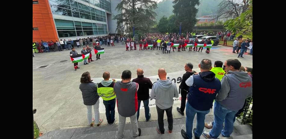 Ante esta situación, como si no conociera desde hace años la complicidad de CAF con el genocidio del pueblo palestino, el Comité de empresa de CAF-Beasain convocó a sus trabajadores a un paro de una hora. La convocatoria era para hoy, miércoles, de 10:00 a 11:00. Este paro ya se celebrado. Pero la concentración la han hecho dentro de la empresa, a puertas cerradas y fuera del alcance visual de la población.