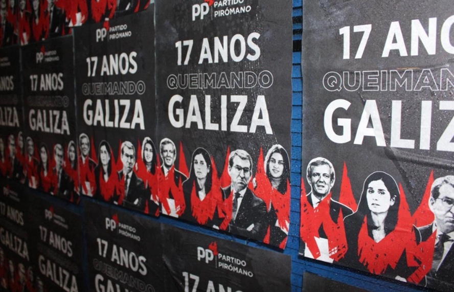Varias fachadas de las sedes del Partido Popular de Galicia fueron pegadas con carteles durante la pasada noche. Al menos seis locales han aparecido cubiertos de carteles en los que se acusa a la formación conservadora de ser un “partido pirómano”. Las sedes atacadas han sido, al menos, las de Santiago, Ourense, Sada, Lugo y Gondomar, según figura en un correo electrónico con fotos enviado a los medios de comunicación. En esa comunicación se indica que los carteles no llevan la firma de ninguna organización. En ellas los carteles recuerdan que el PP lleva 17 años quemando Galicia.