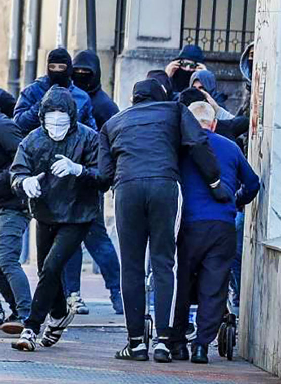 Pero, lamentablemente, pasaba por allí un señor mayor apoyándose en su taca taca. Y he aquí lo que queremos subrayar. Con el peligro muy cerca (la policía), un manifestante antifascista se arriesga a ser alcanzado por los uniformados para ayudar al señor.