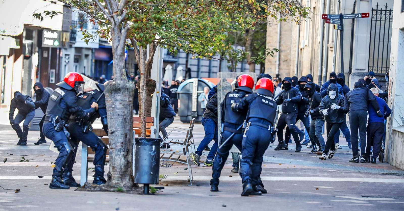 La imagen es del pasado 12 de octubre, en Gasteiz, cuando la Ertzaintza reprimía a la contramanifestación antifascista. Como se puede observar en la fotografía, los agentes de la policía están muy cerca de algunos manifestantes con la intención de golpearlos y detenerlos, como hicieron con tantos otros.