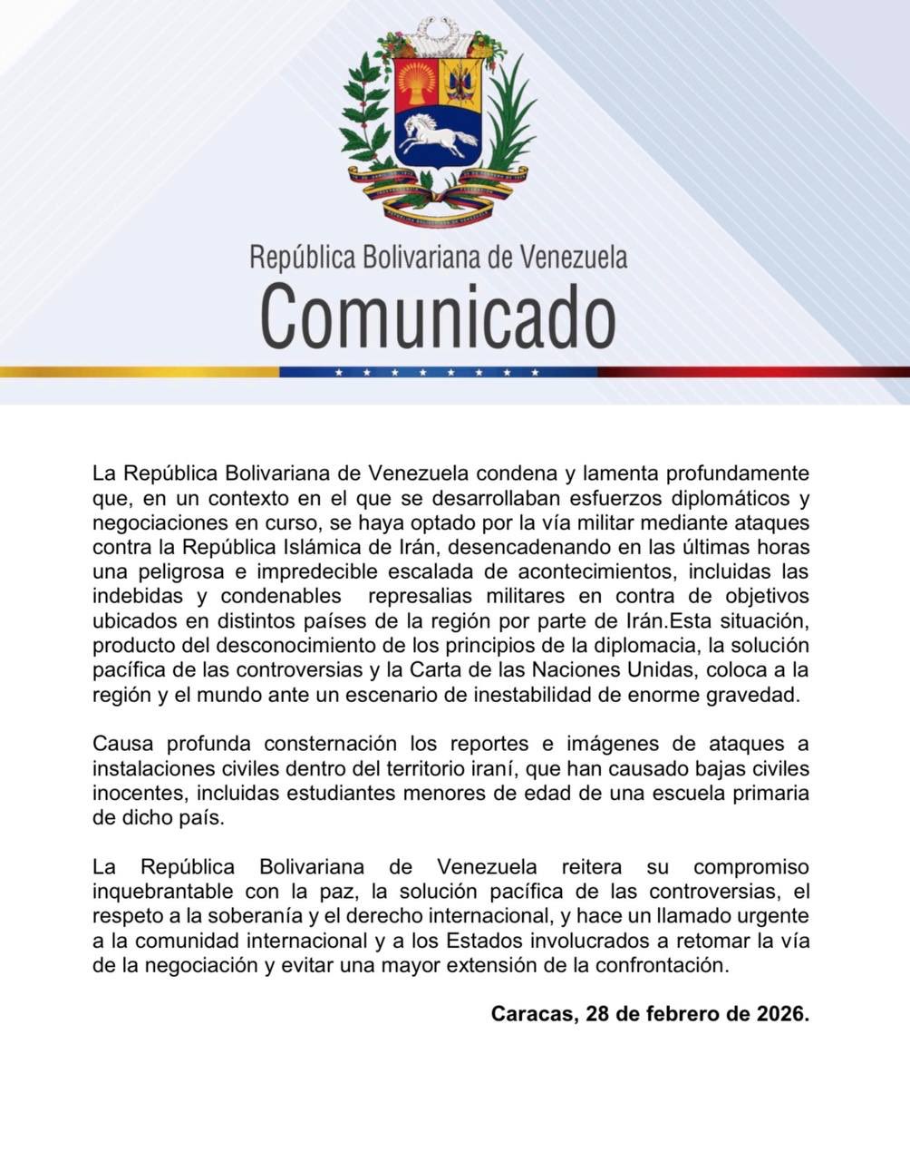 La República Bolivariana de Venezuela condena y lamenta profundamente que, en un contexto en el que se desarrollaban esfuerzos diplomáticos y negociaciones en curso, se haya optado por la vía militar mediante ataques contra la República Islámica de Irán, desencadenando en las últimas horas una peligrosa e impredecible escalada de acontecimientos, incluidas las indebidas y condenables represalias militares en contra de objetivos ubicados en distintos países de la región por parte de Irán. Esta situación, producto del desconocimiento de los principios de la diplomacia, la solución pacífica de las controversias y la Carta de las Naciones Unidas, coloca a la región y el mundo ante un escenario de inestabilidad de enorme gravedad.