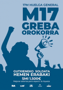 Steilas, Hiru y Etxalde, ELA y LAB han convocado para el 17 de marzo, a favor del establecimiento, entre otras demandas, de un salario mínimo de 1.500 € en el País Vasco Sur. La mayoría sindical vasca no espera que sindicatos con menos representación como CC.OO y UGT se sumen, ya que el gobierno vasco lo integra también su aliado, el PSOE, y no es cuestión de molestarlo.